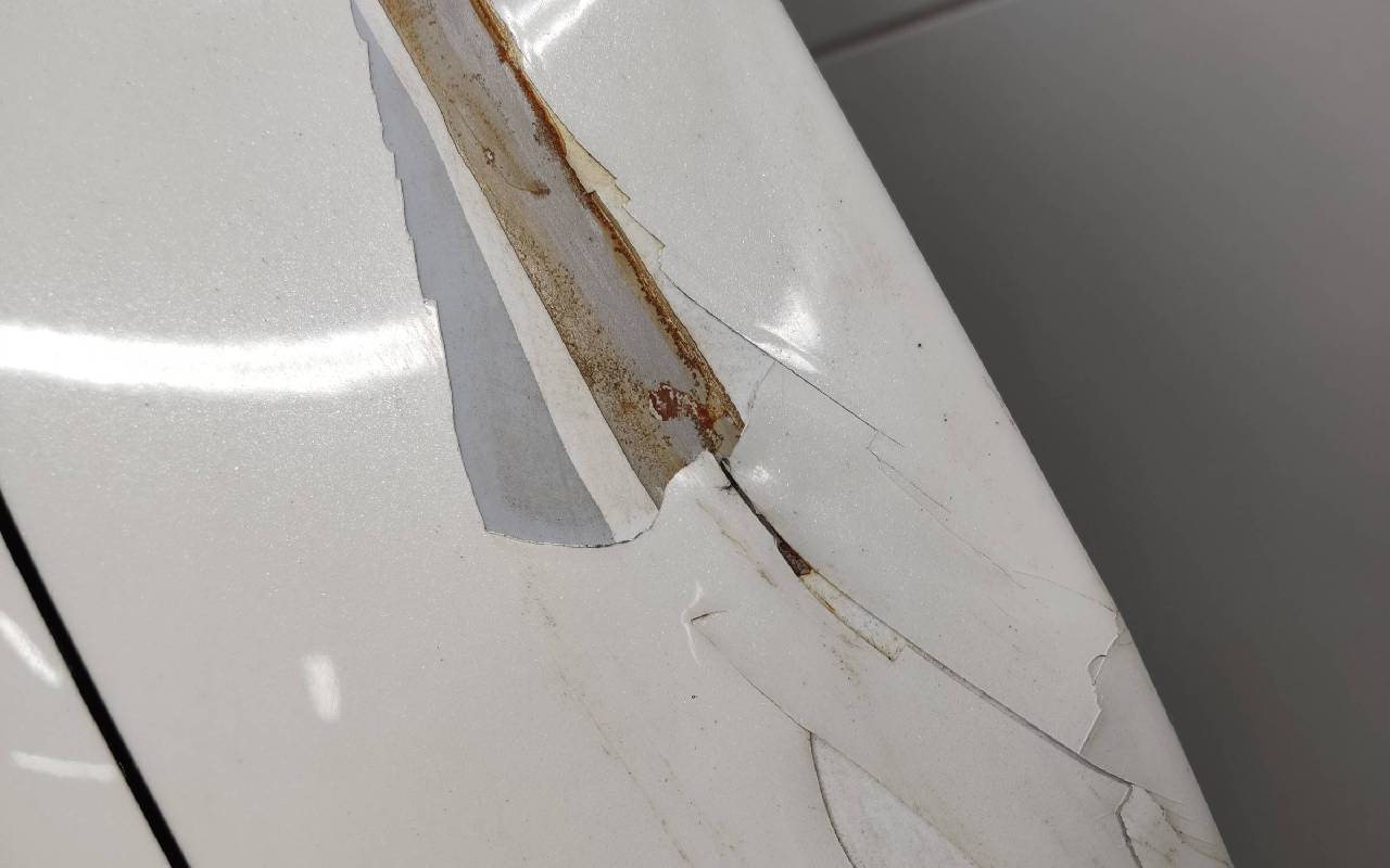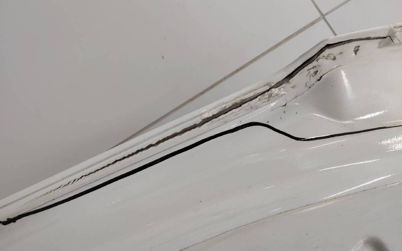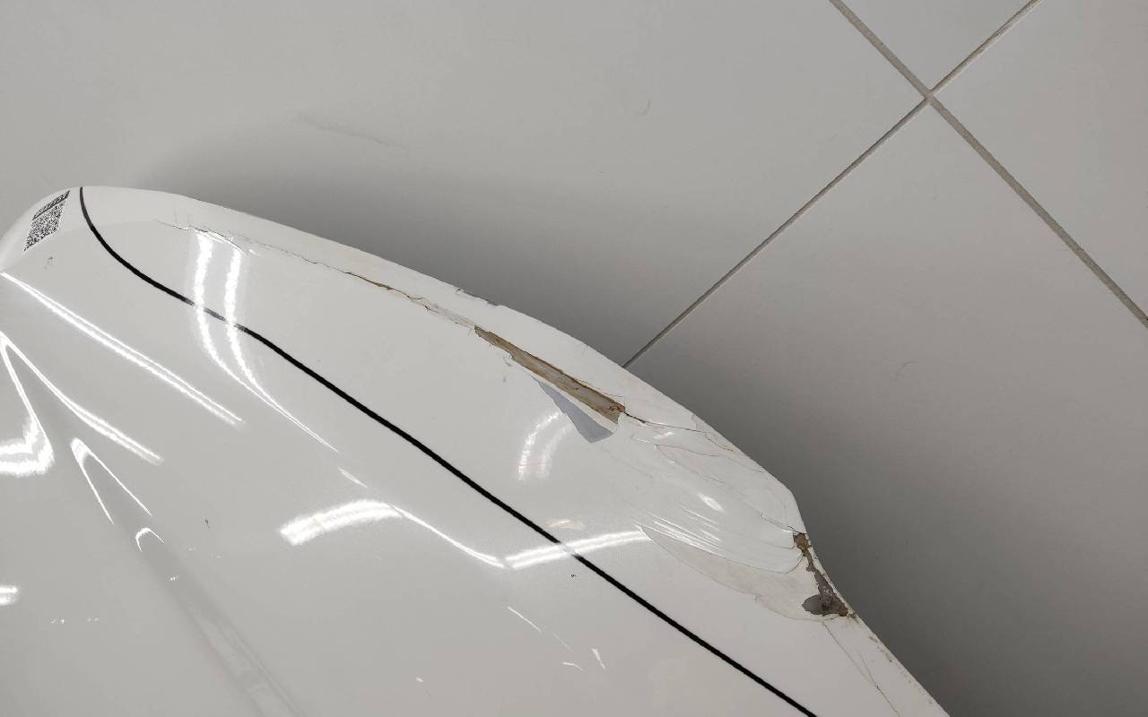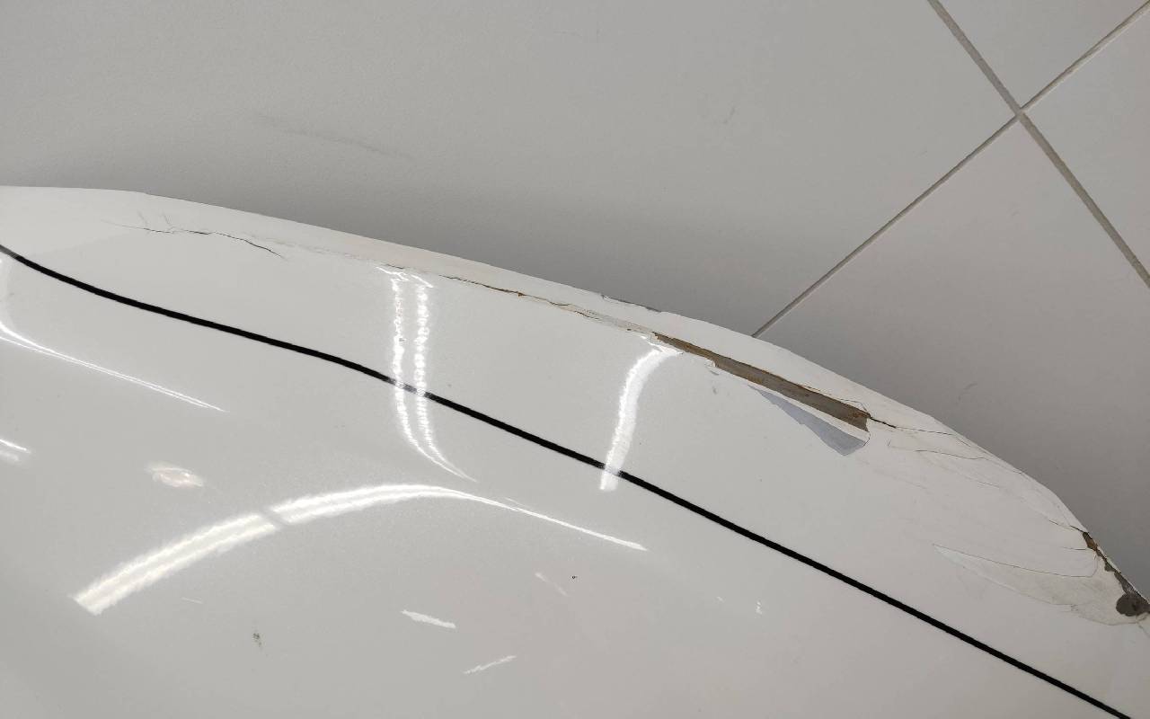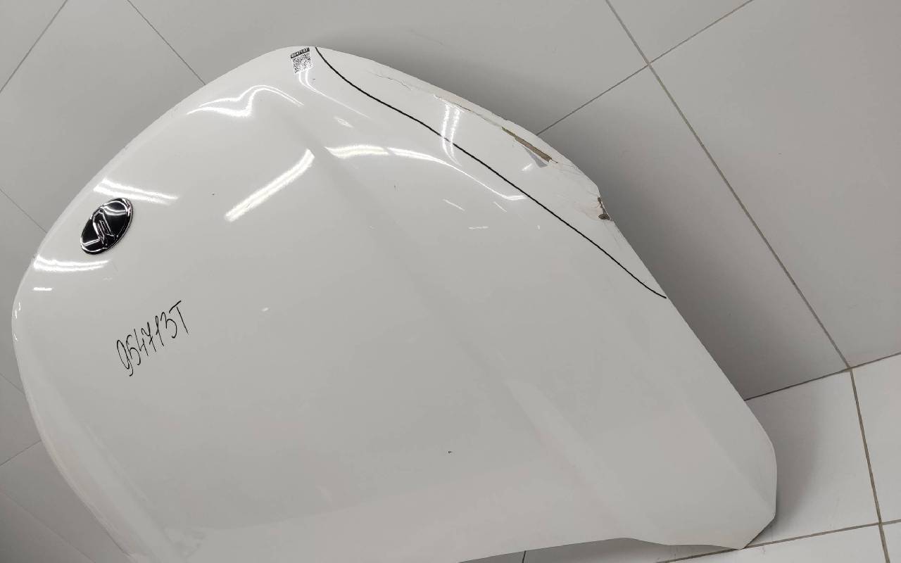 Состояние детали удовлетворительное. Белого цвета (перламутр), скол ЛКП. Ранее производился ремонт. Вмятина, лопнул шов. Потребуется ремонт