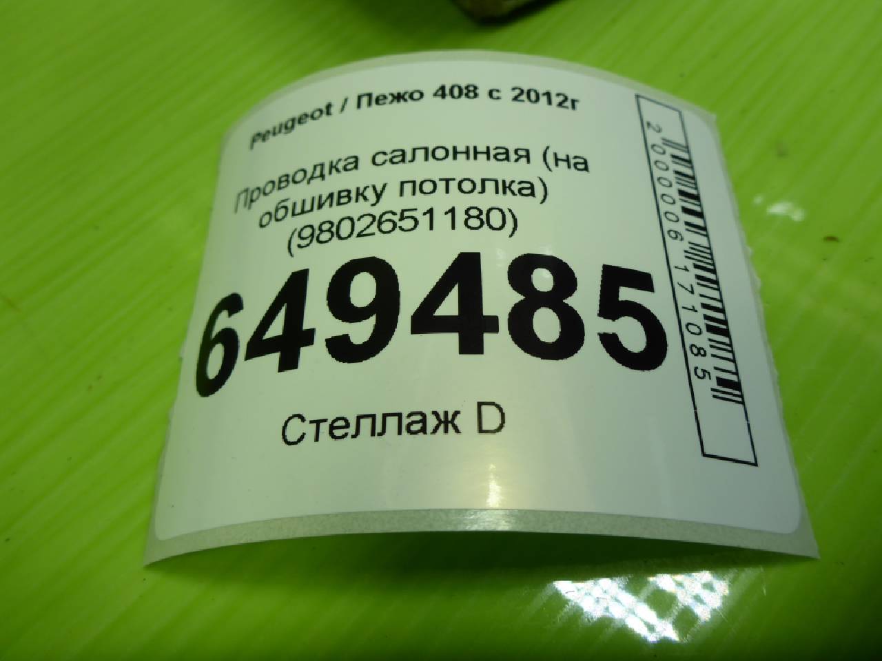 Деталь: Peugeot 408 - Проводка салонная (на обшивку потолка) (9802651180)