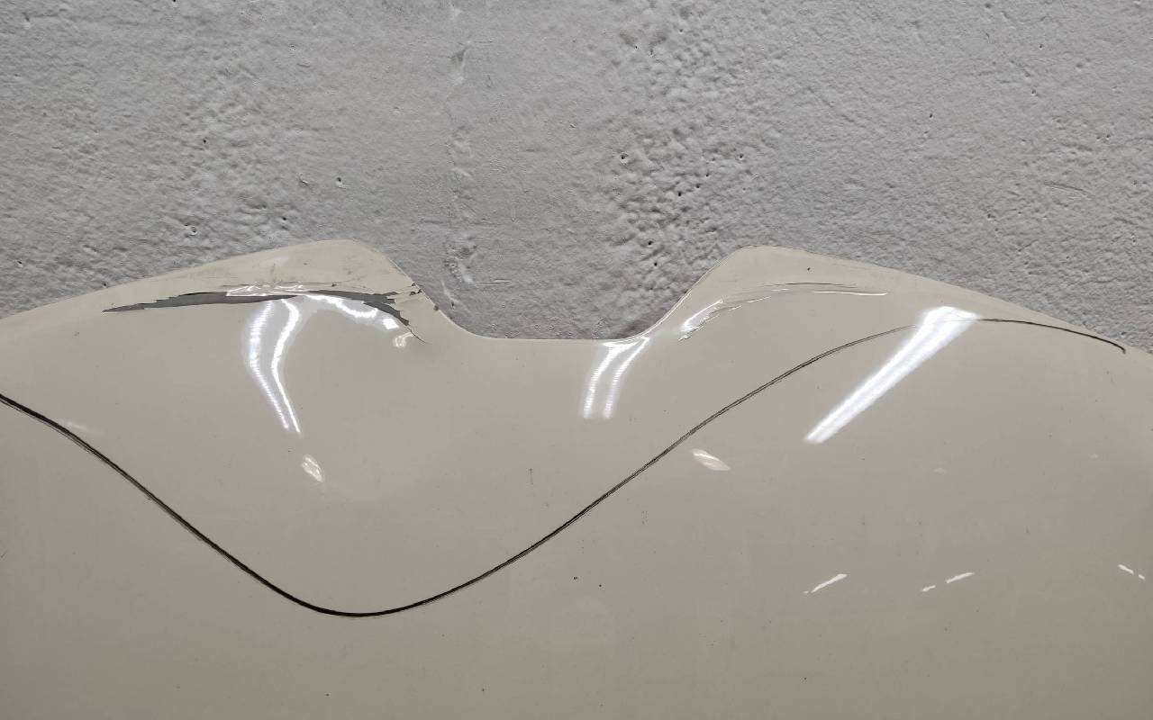 Состояние детали хорошее. Бежевого цвета, скол ЛКП. Вмятина в передней части и на внутренней поверхности. Потребуется ремонт