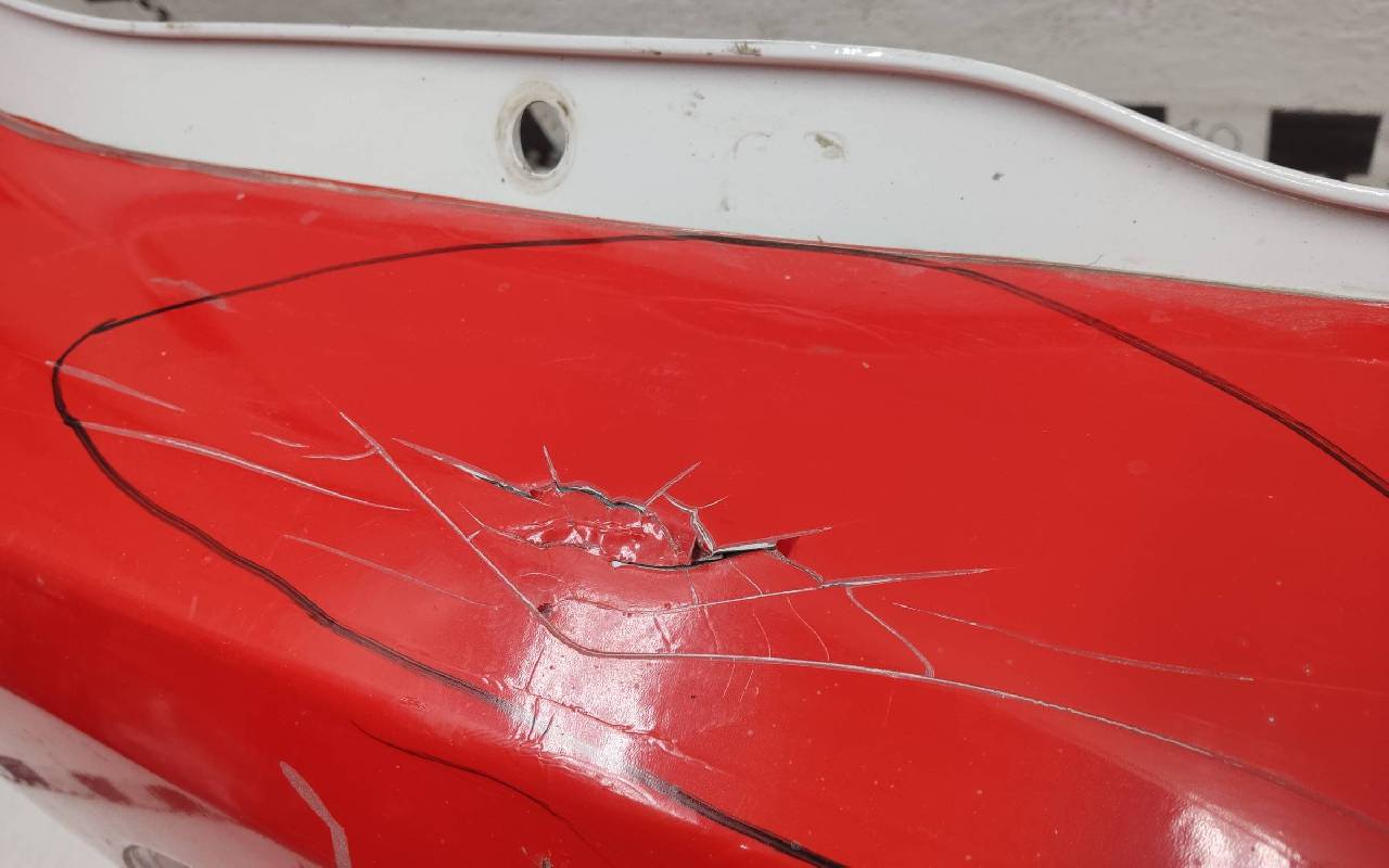 Состояние детали хорошее. Белого цвета в красной плёнке. Вмятина на полке, дефект пластика. Крепления целые. Потребуется ремонт