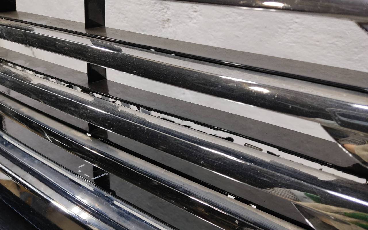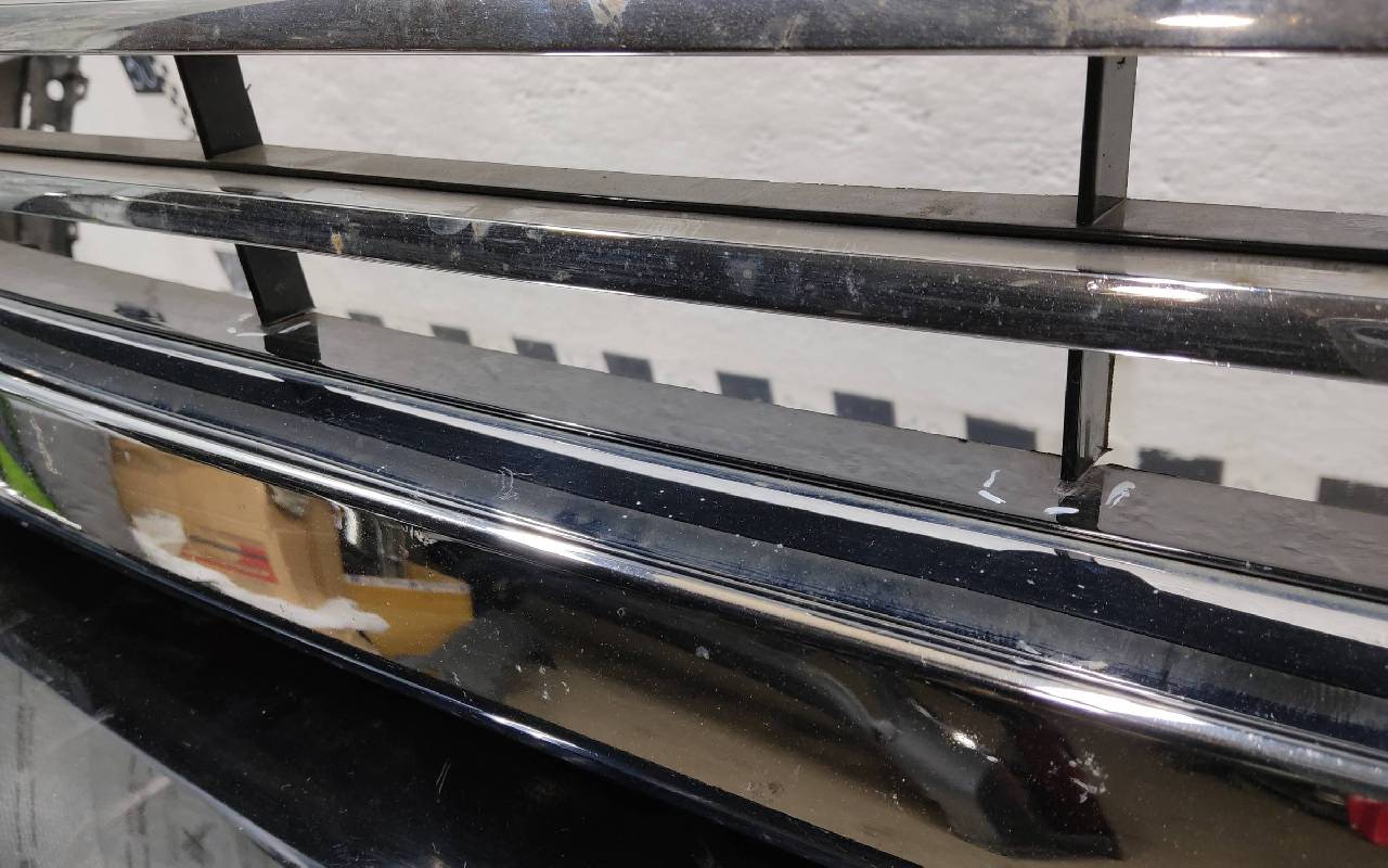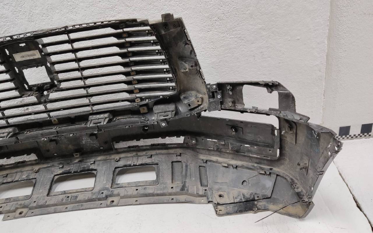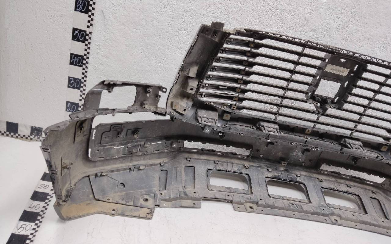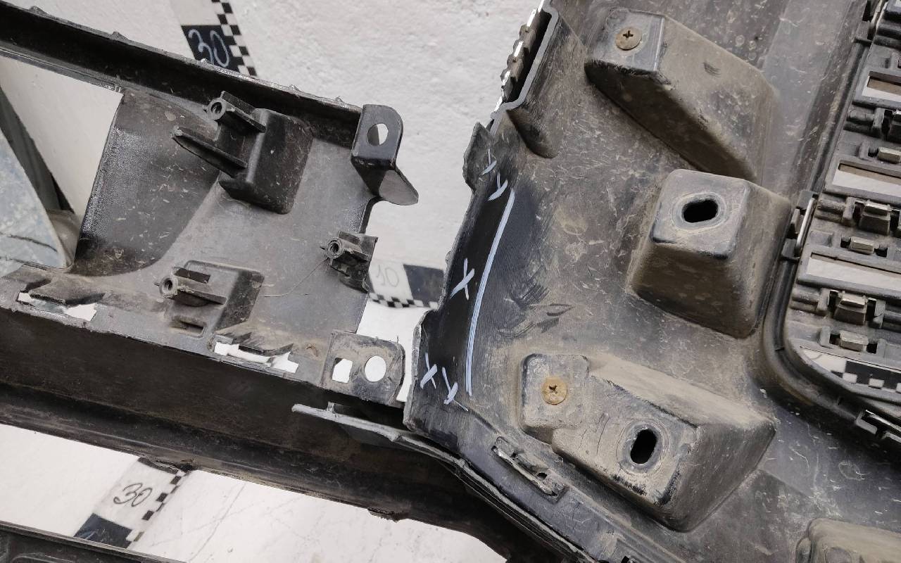 Состояние детали удовлетворительное. Чёрного цвета под парктроники. После небольшого ремонта, царапины. Решетка с трещинами. Отсутствует левый кронштейн решетки на 4 крепления. Дефект одного на бампере под юбку. Потребуется дополнительный ремонт