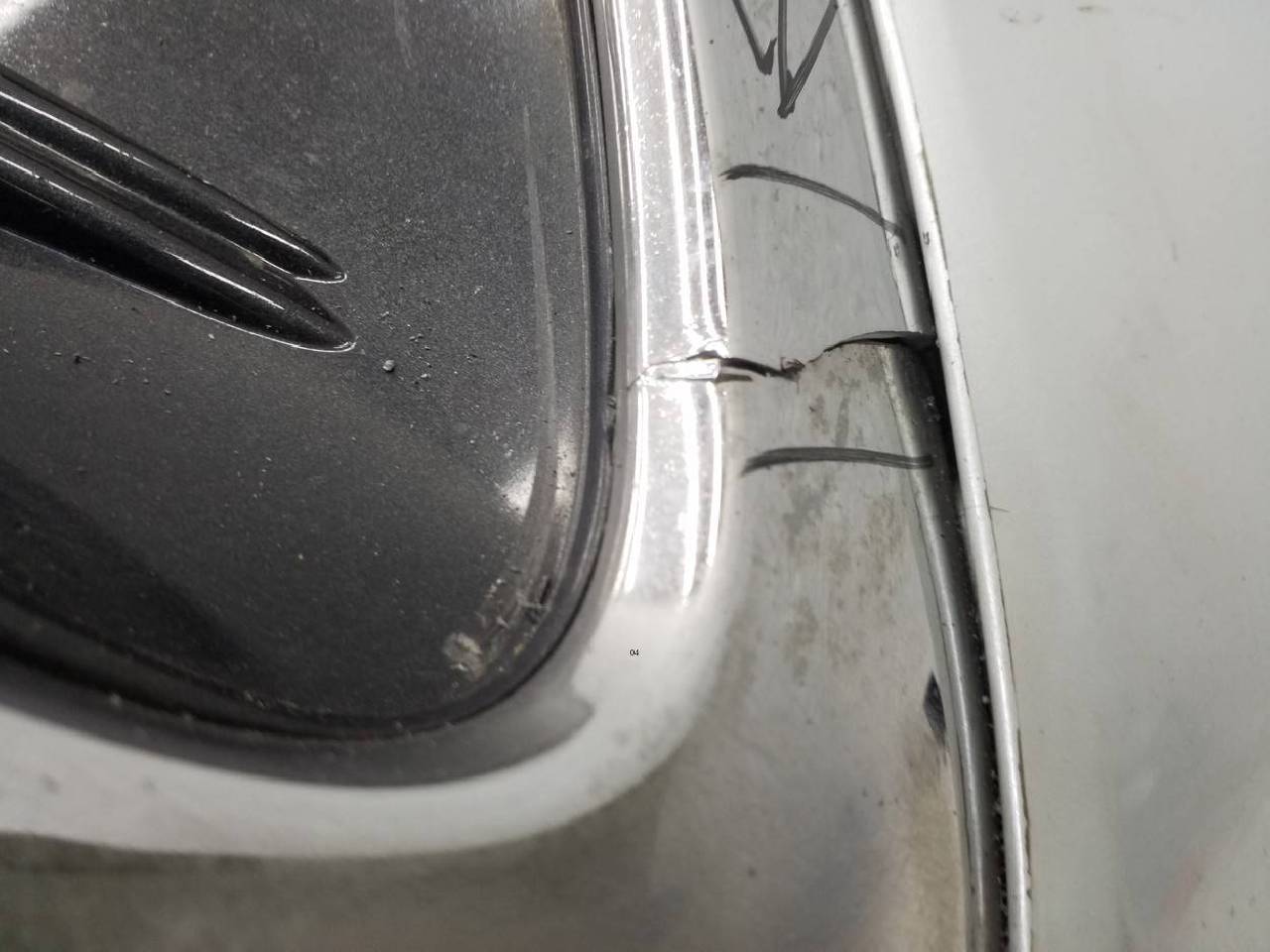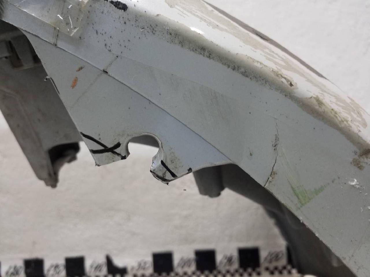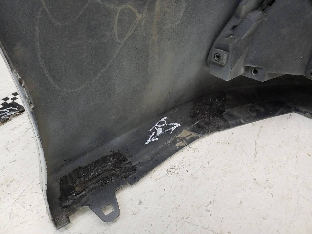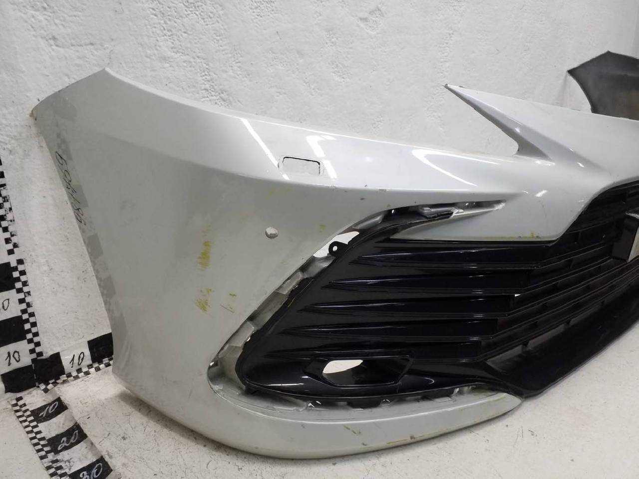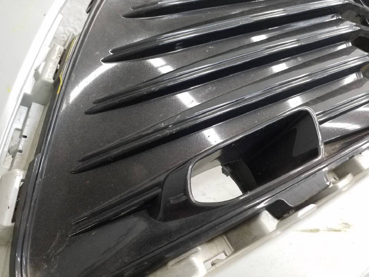 Состояние детали хорошее. В пленке под парктроники и омыватели фар, после ремонта, потёртости поверхности, дефект пластика на фото. Отсутствует одно крепление, хром разбит. Потребуется дополнительный ремонт