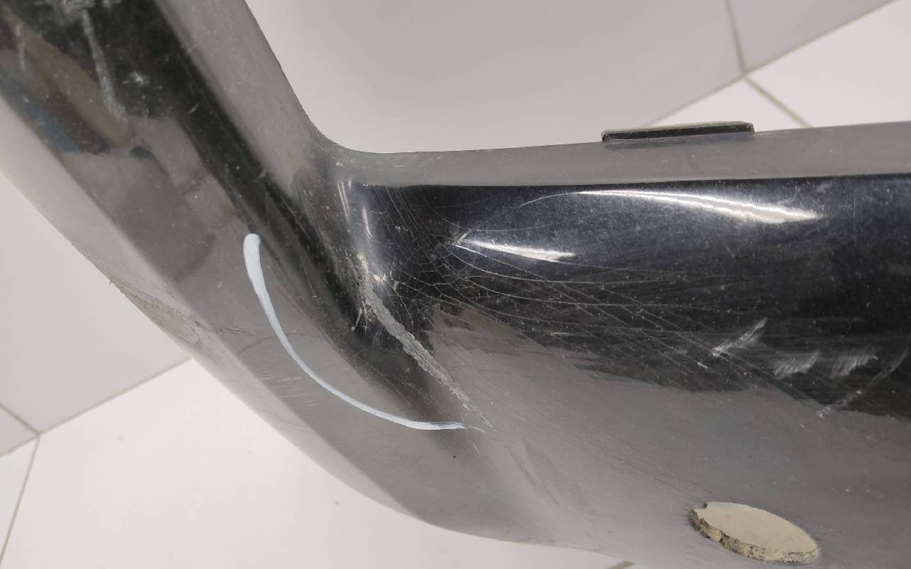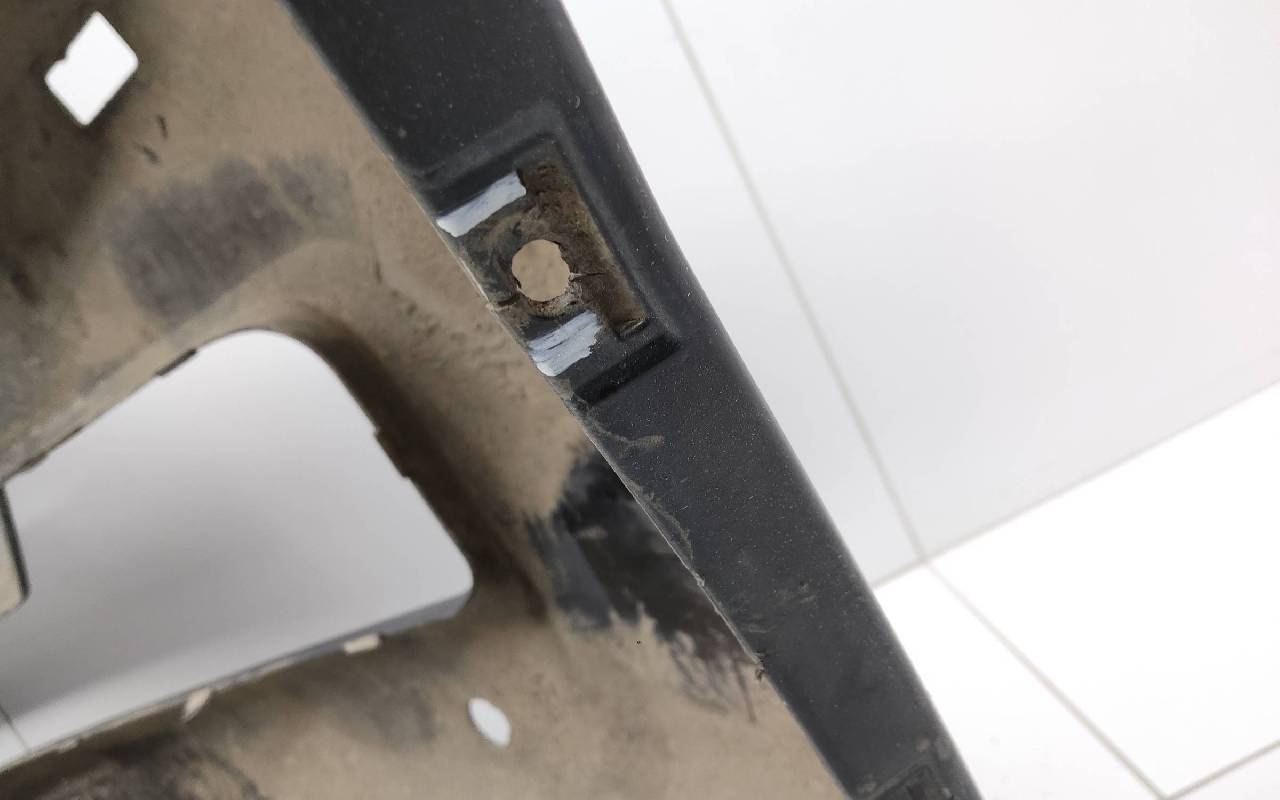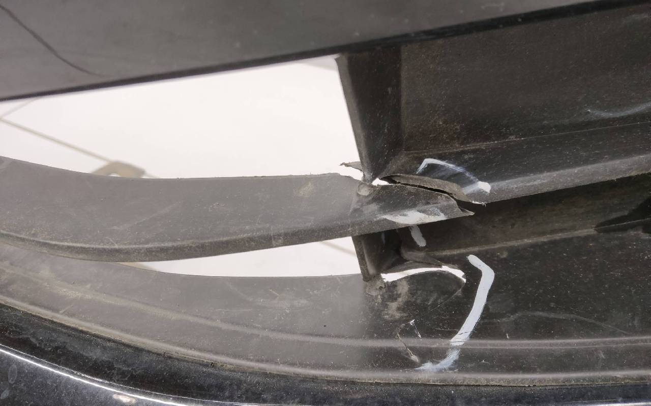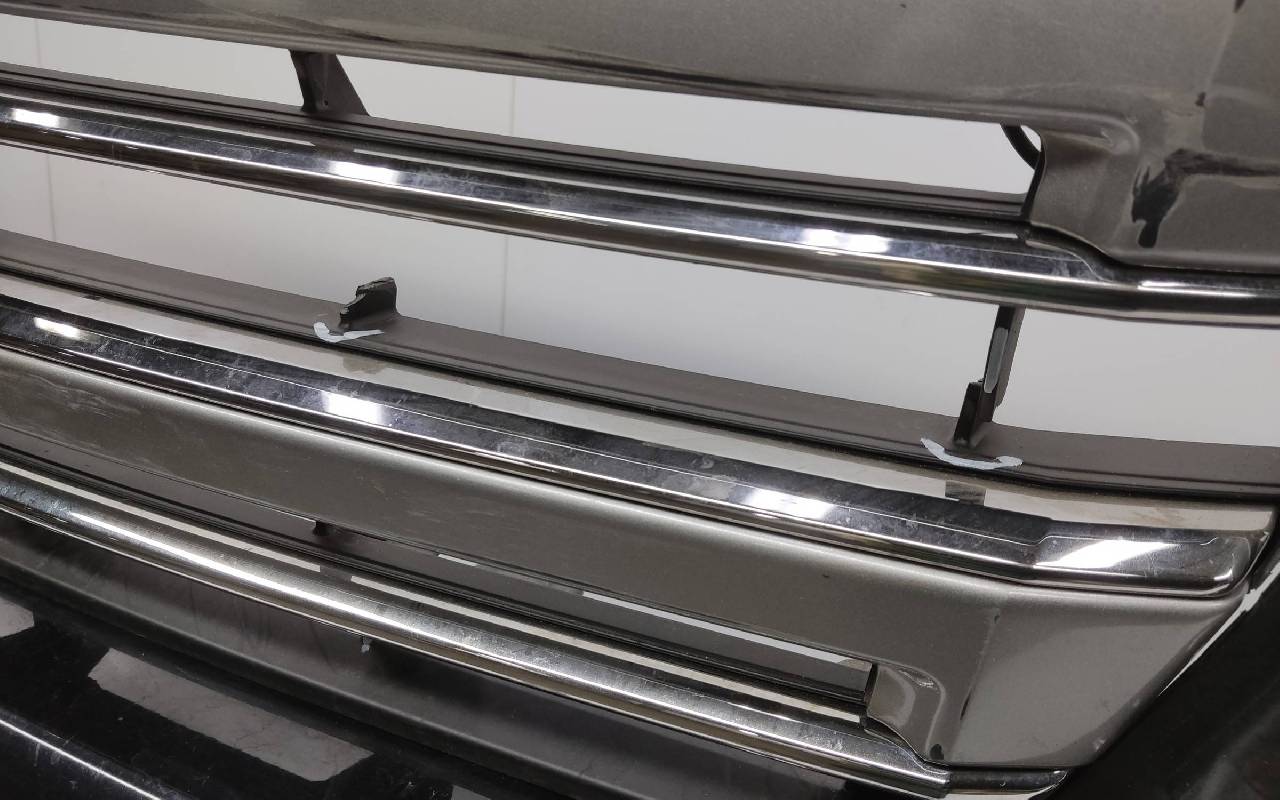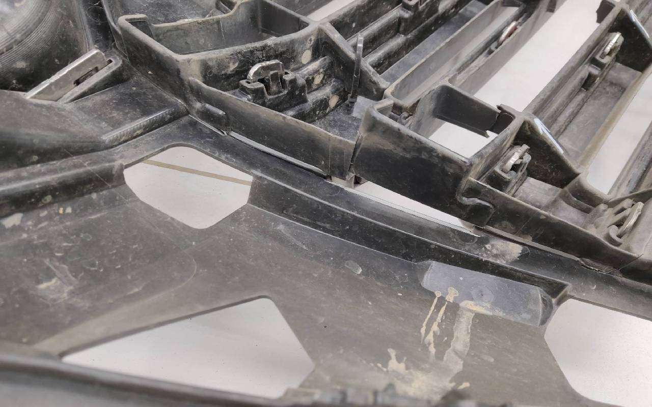 Состояние детали удовлетворительное. Чёрного цвета под парктроники и омыватели фар. После небольшого ремонта, царапины вмятинка. Скол нескольких перемычек, трещины на решетках, потёртость. Крепления целые, дефект одного замка справа. Потребуется незначительный дополнительный ремонт