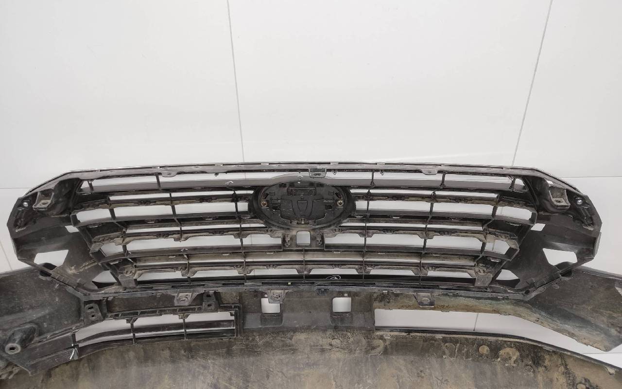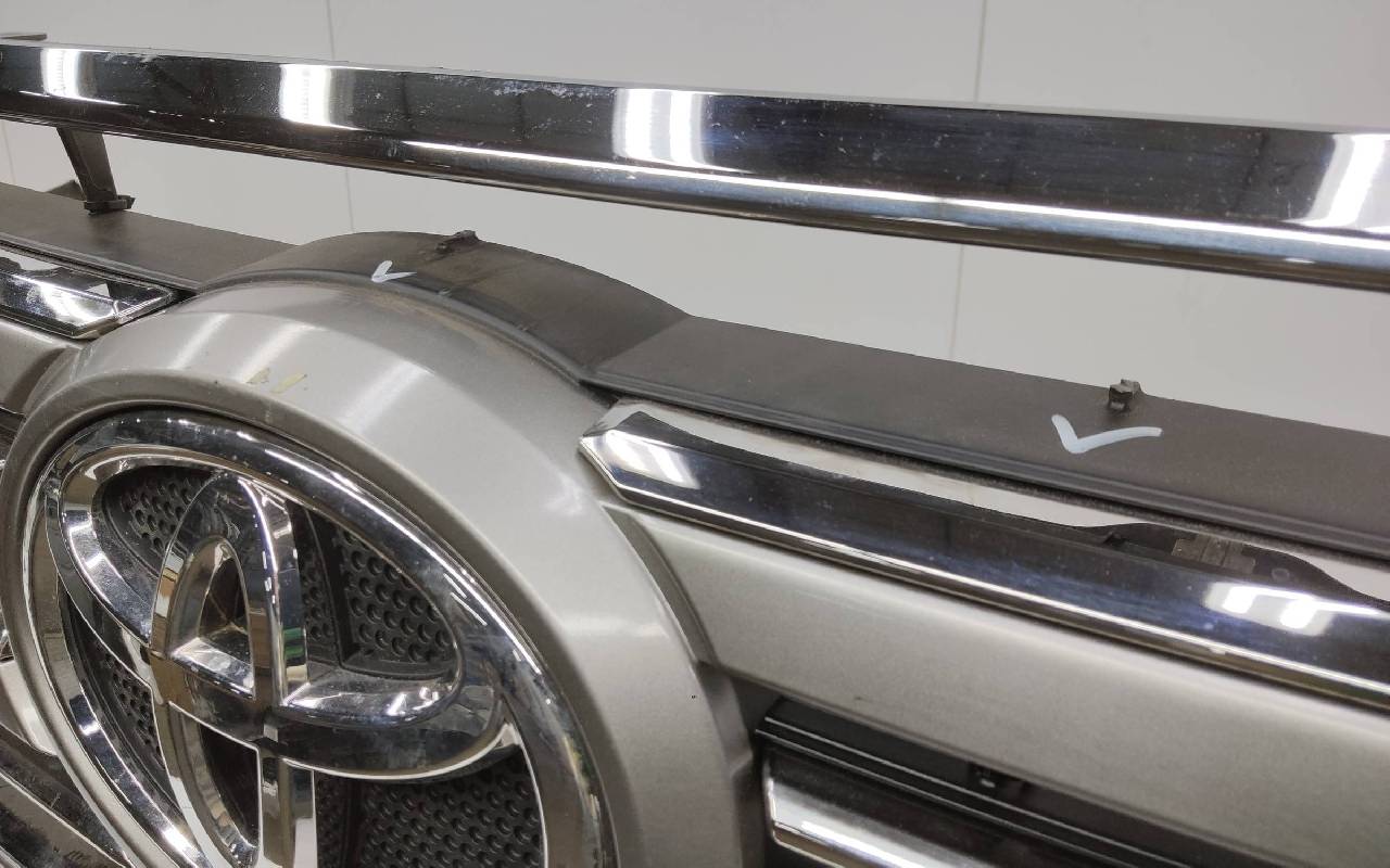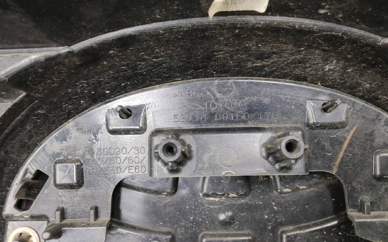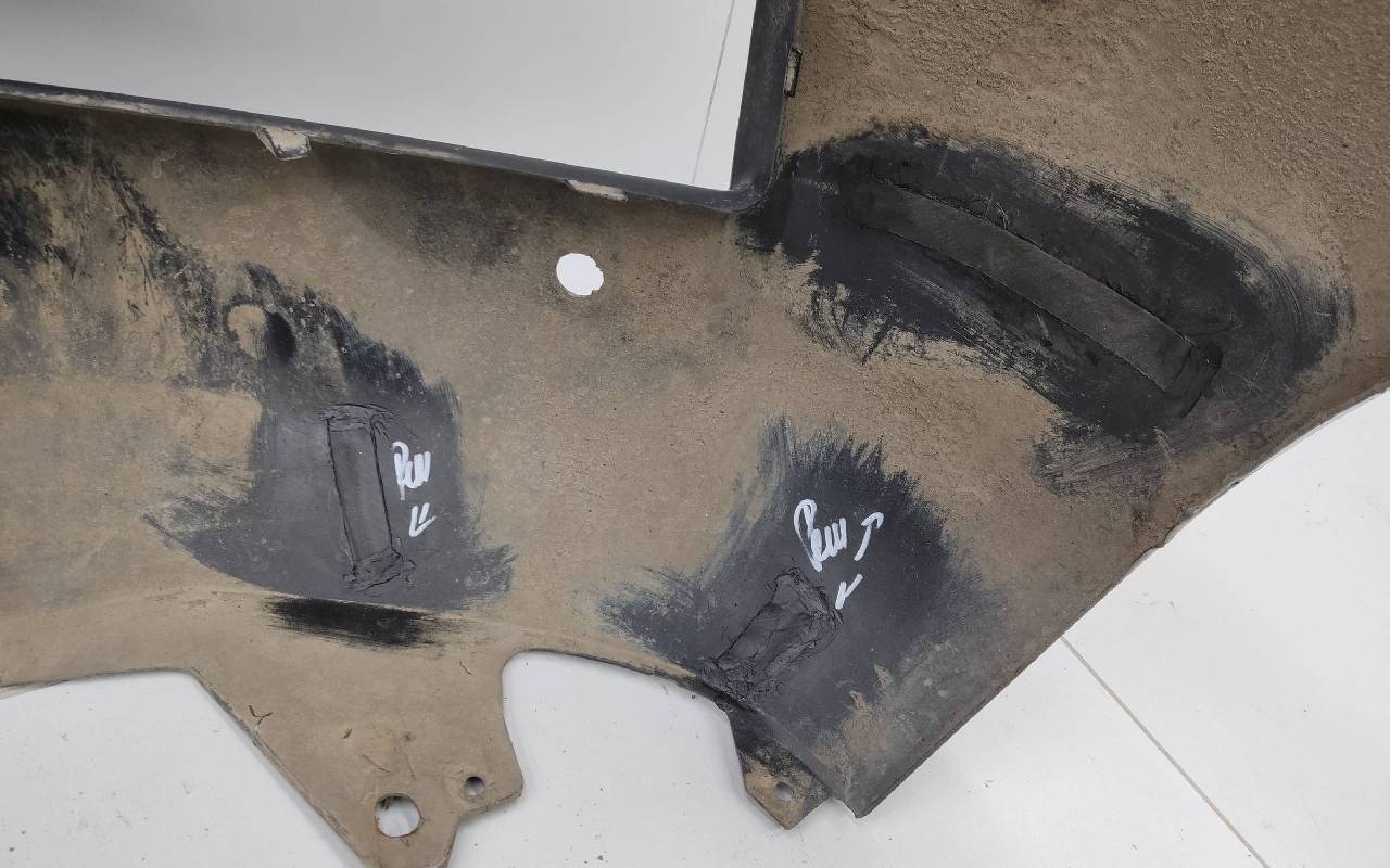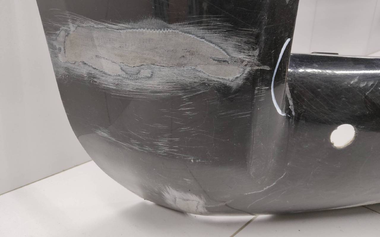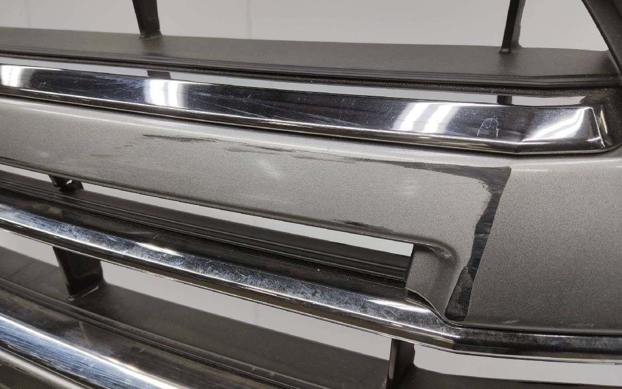 Состояние детали удовлетворительное. Чёрного цвета под парктроники и омыватели фар. После небольшого ремонта, царапины вмятинка. Скол нескольких перемычек, трещины на решетках, потёртость. Крепления целые, дефект одного замка справа. Потребуется незначительный дополнительный ремонт
