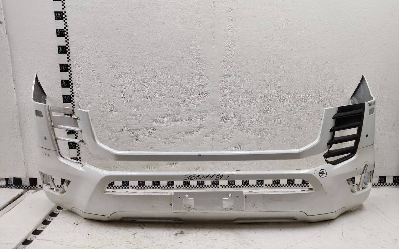 Состояние детали хорошее. Белого цвета под парктроники и омыватели фар. После небольшого ремонта. В плёнке, дефект пластика. Отсутствуют пять креплений под верхнюю часть, пять креплений на юбке и одно на рамке. Потребуется дополнительный ремонт