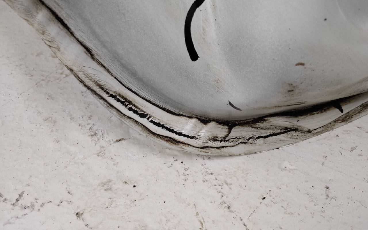 Состояние детали плохое. Белого цвета (перламутр), скол ЛКП. Вмятины на внешней и внутренней поверхности, дефект металла. Потребуется ремонт
