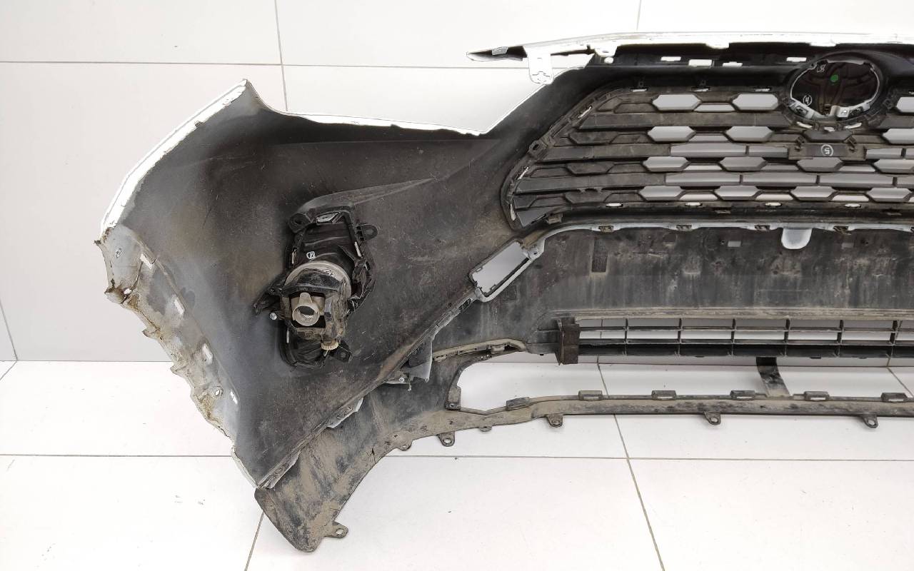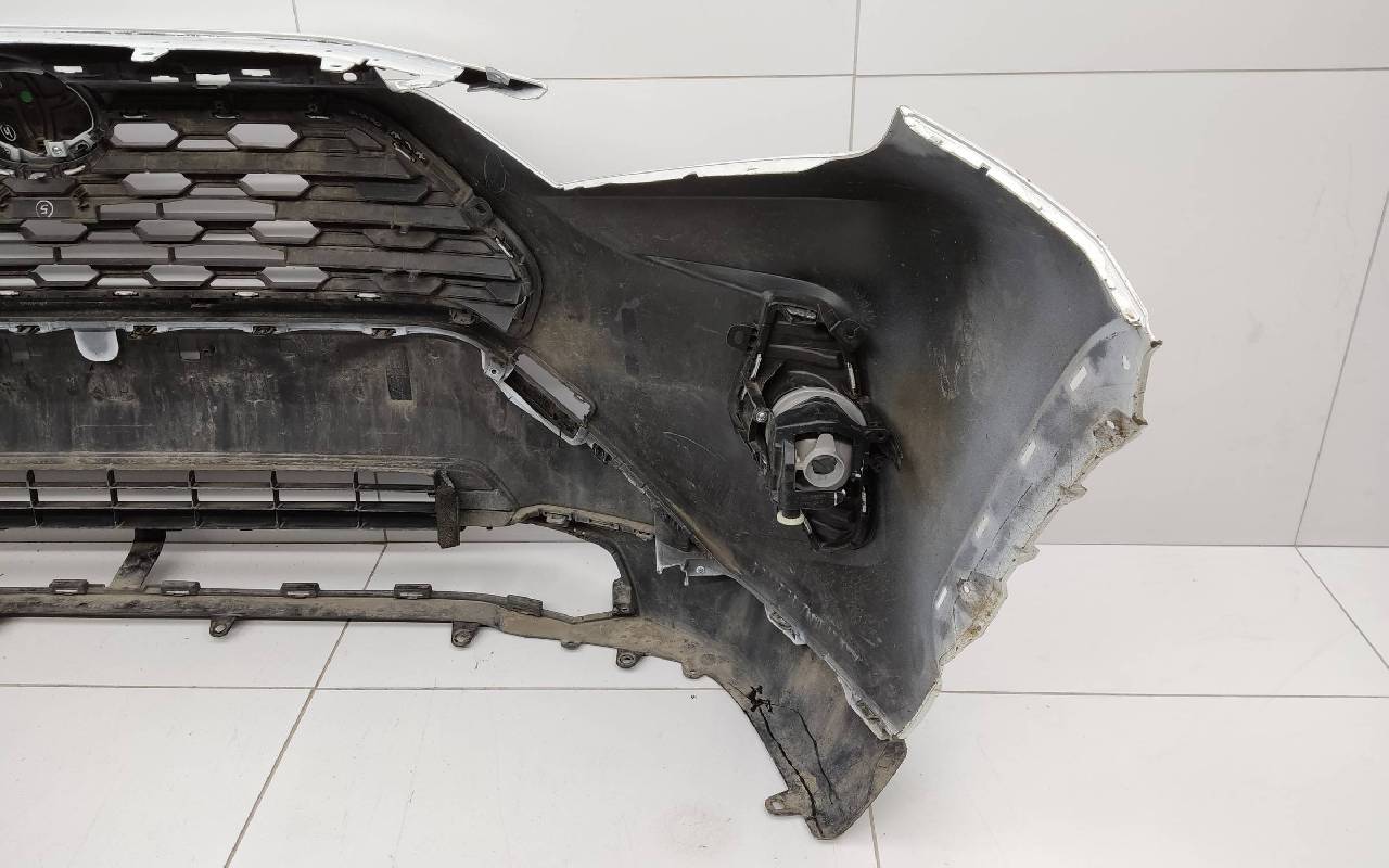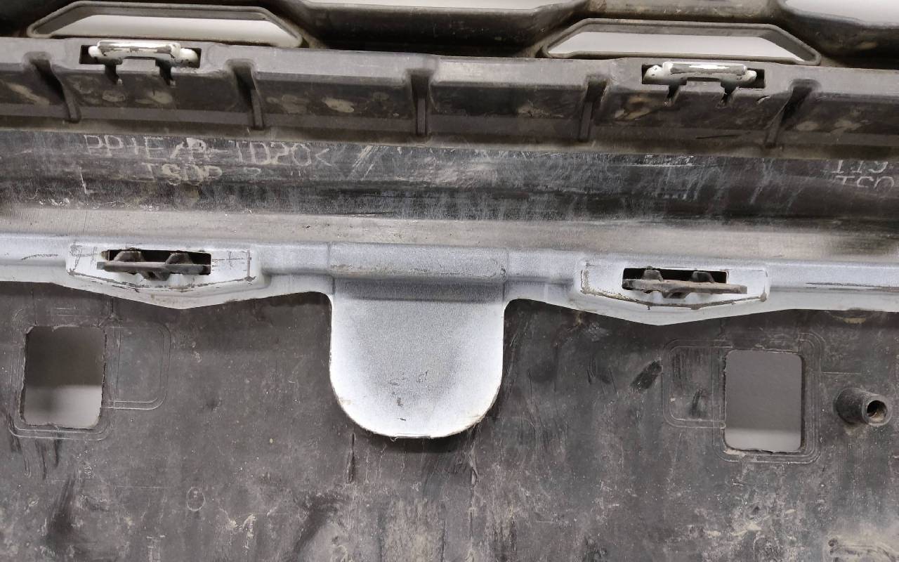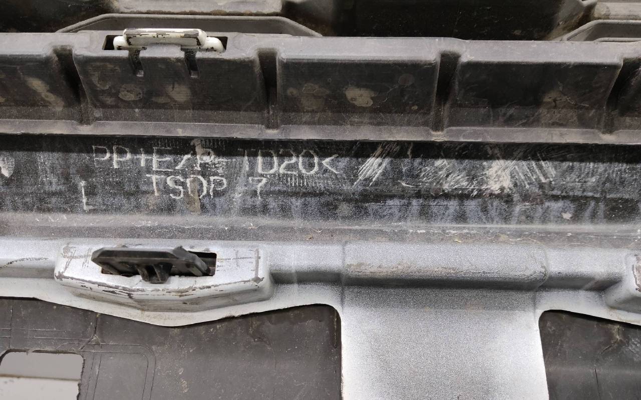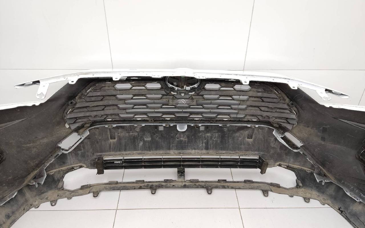 Состояние детали хорошее. Белого цвета (перламутр) в сборе без заглушка и нижней накладки. Царапины. Небольшие трещины по левому кронштейну под накладку, дефект одного крепления под юбку. Отсутствуют по одному креплению на фарах птф. Потребуется незначительный ремонт