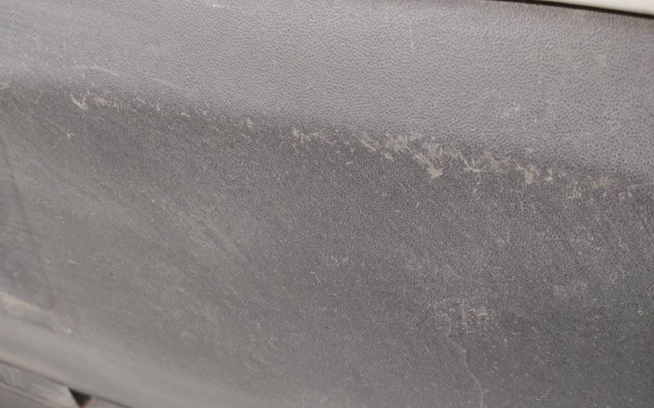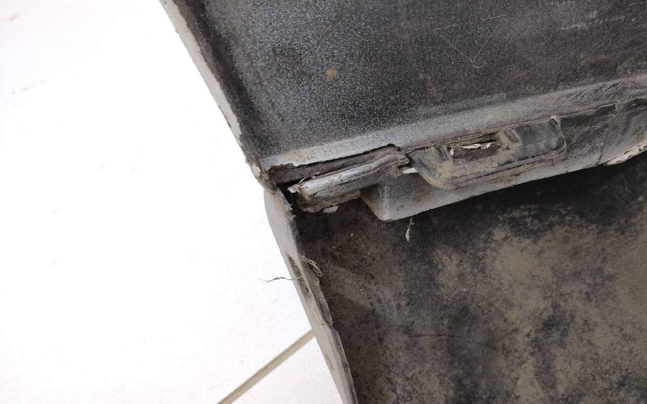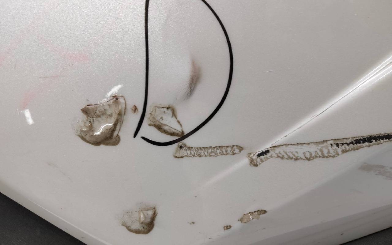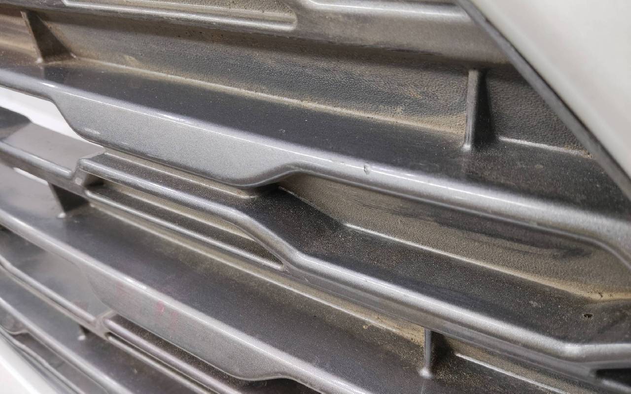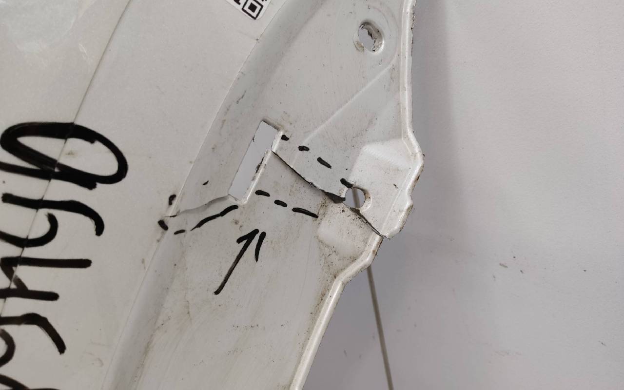 Состояние детали хорошее. Белого цвета (перламутр) в сборе без заглушка и нижней накладки. Царапины. Небольшие трещины по левому кронштейну под накладку, дефект одного крепления под юбку. Отсутствуют по одному креплению на фарах птф. Потребуется незначительный ремонт
