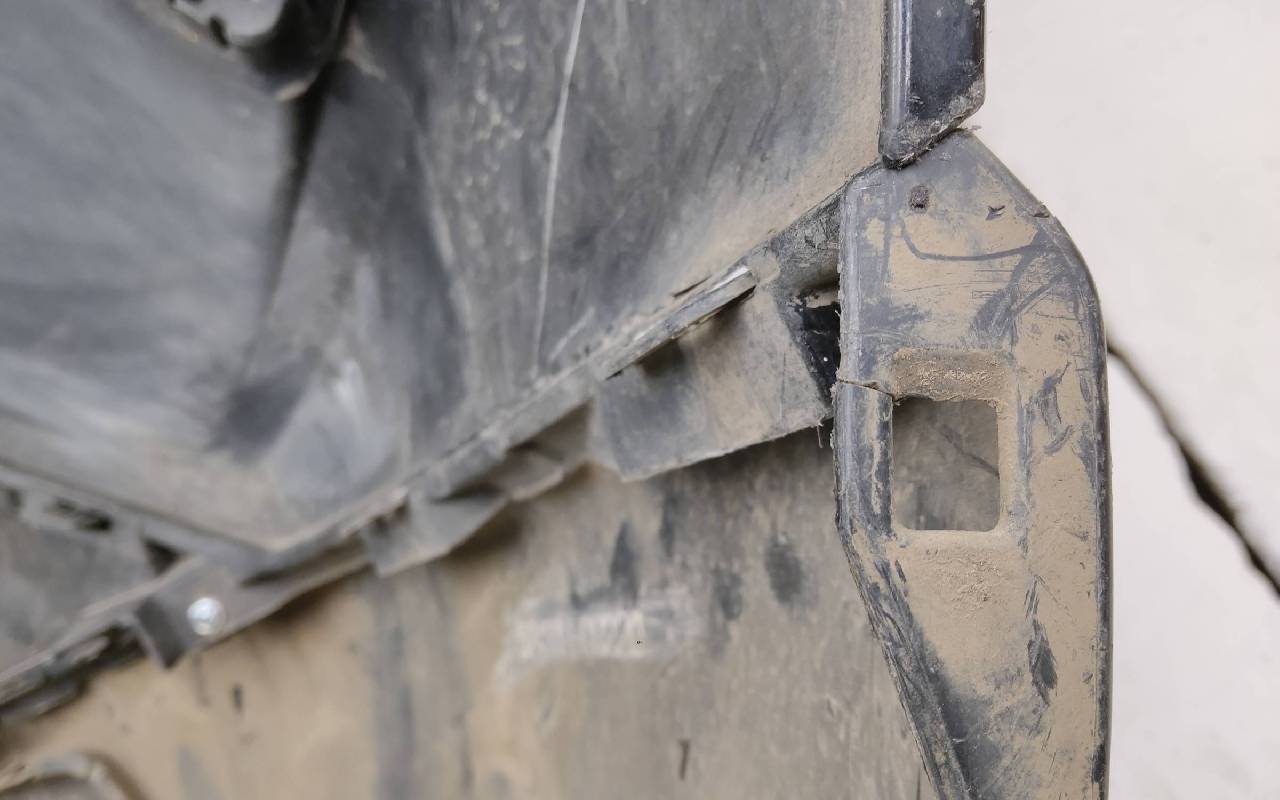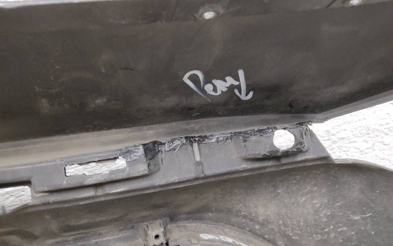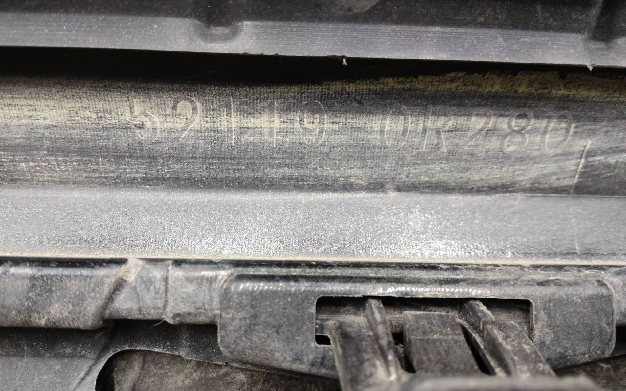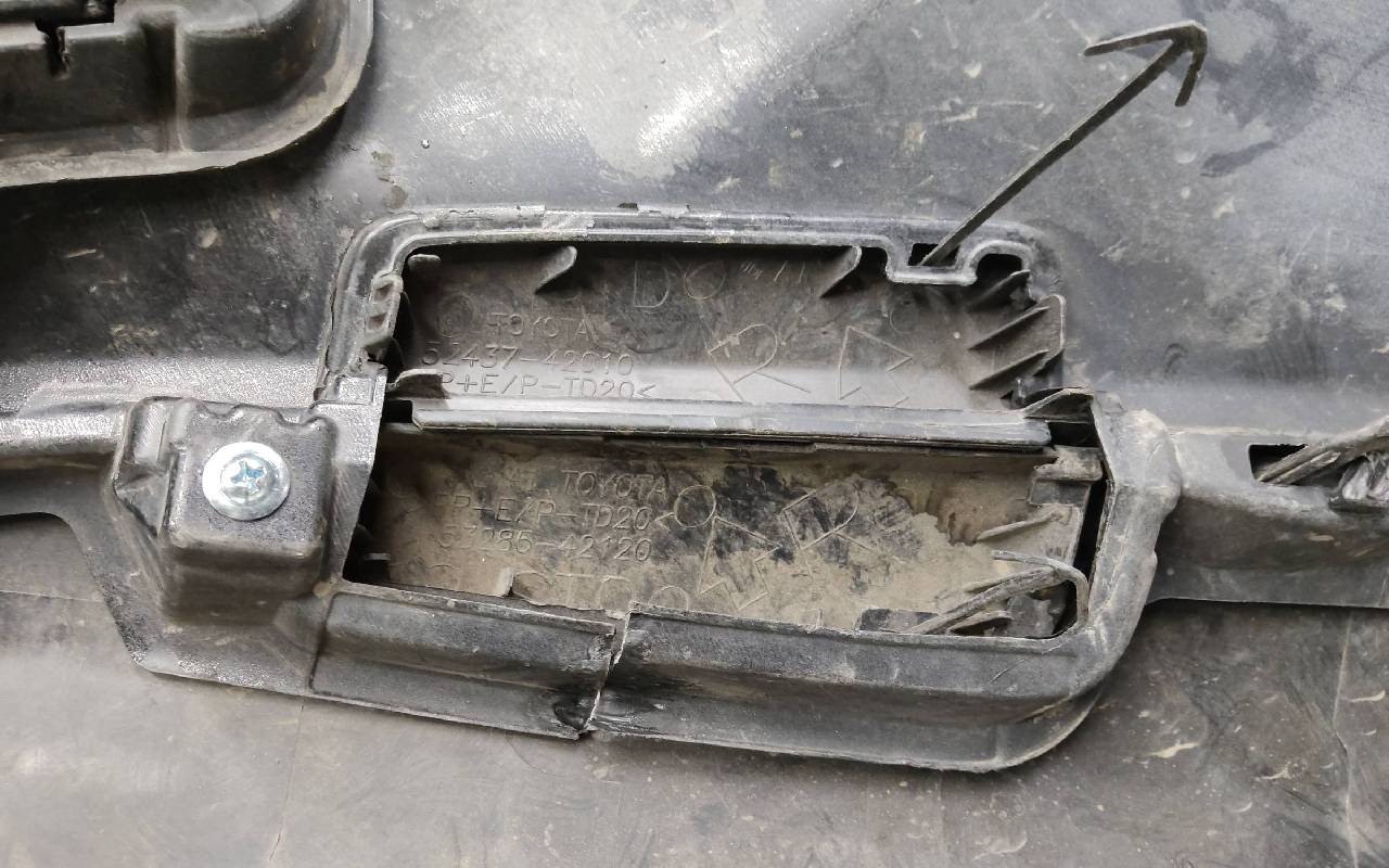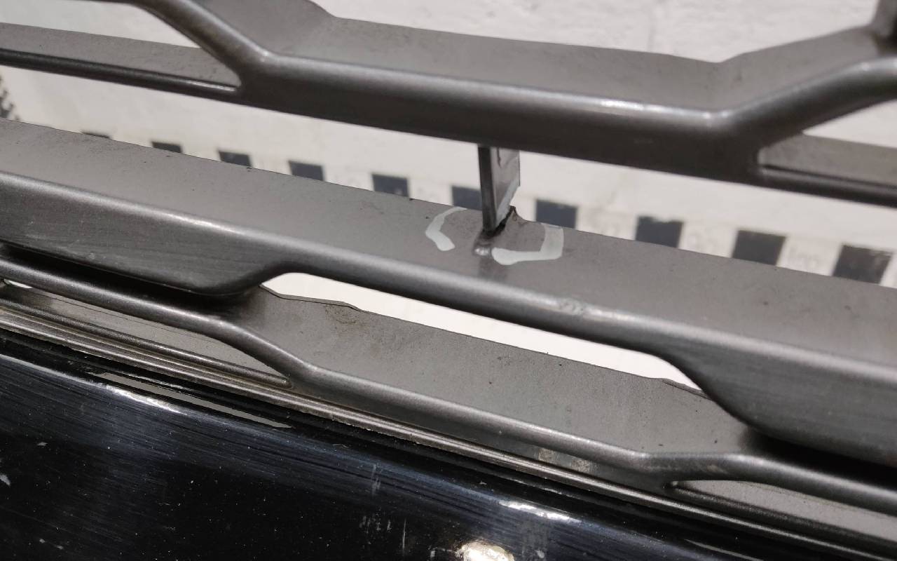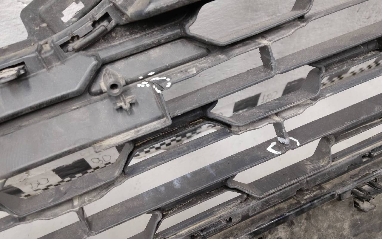 Состояние детали хорошее. Чёрного цвета под парктроники и омыватели фар. В сборе. После небольшого ремонта, царапины, вмятина. Дефект пластика верхней решетки на фото. Лопнул один замок, отсутствует одно крепление на левой рамке. Потребуется незначительный дополнительный ремонт