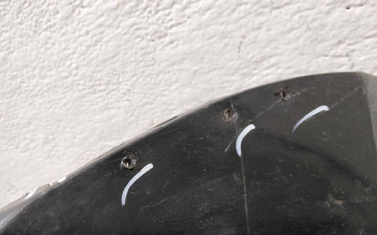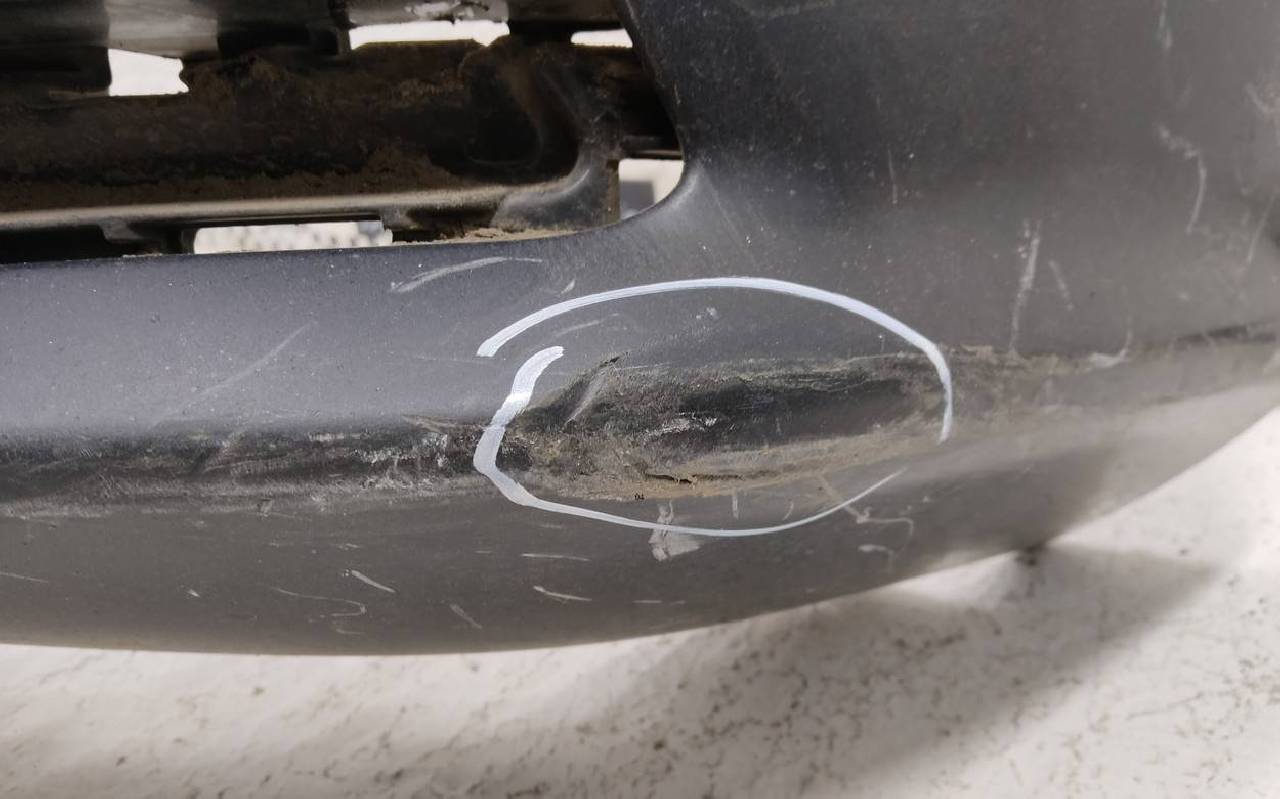 Состояние детали удовлетворительное. Чёрного цвета под парктроники и омыватели фар. Небольшие вмятины, царапины, дополнительные отверстия. Трещинка по верхней кромке. Сломано два крепления. Потребуется ремонт