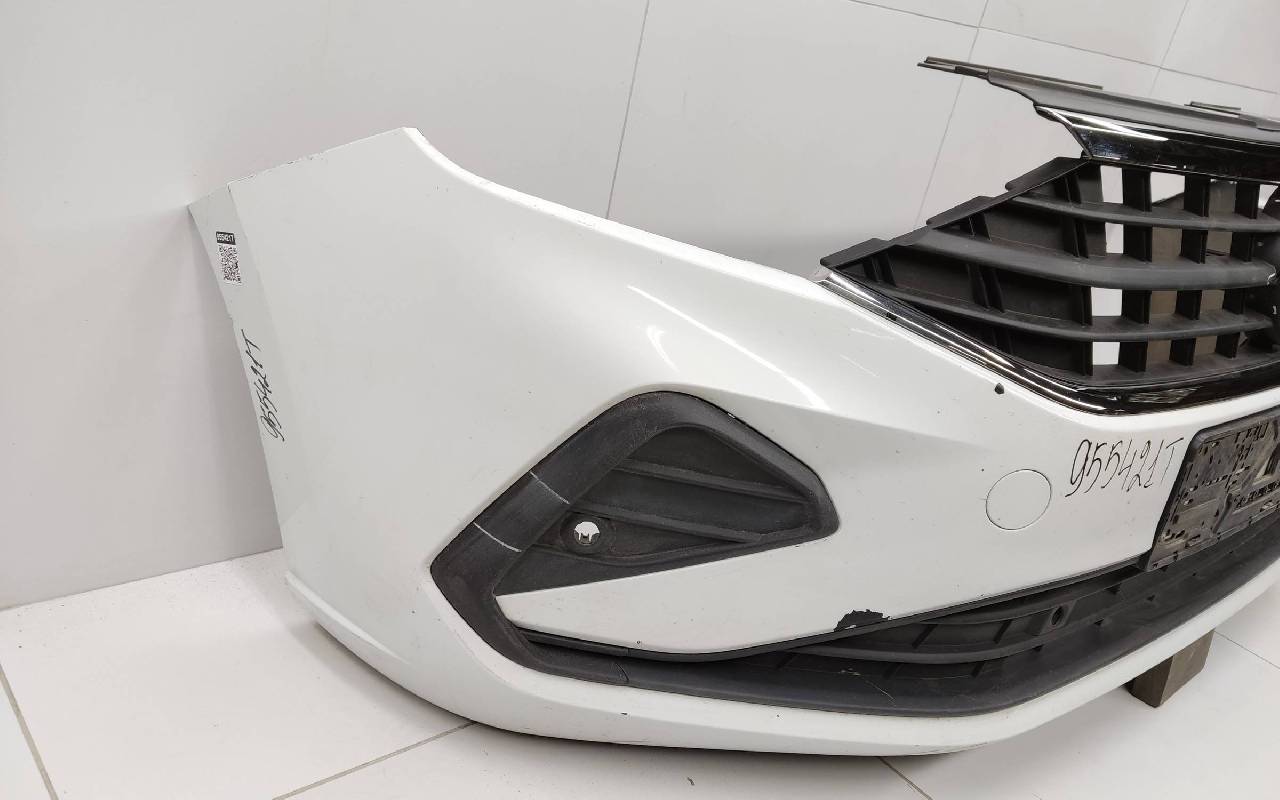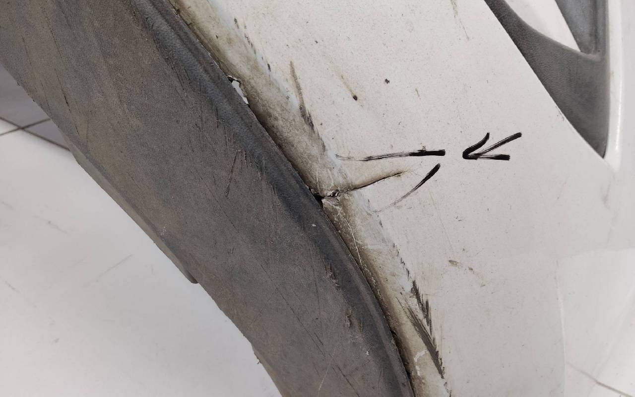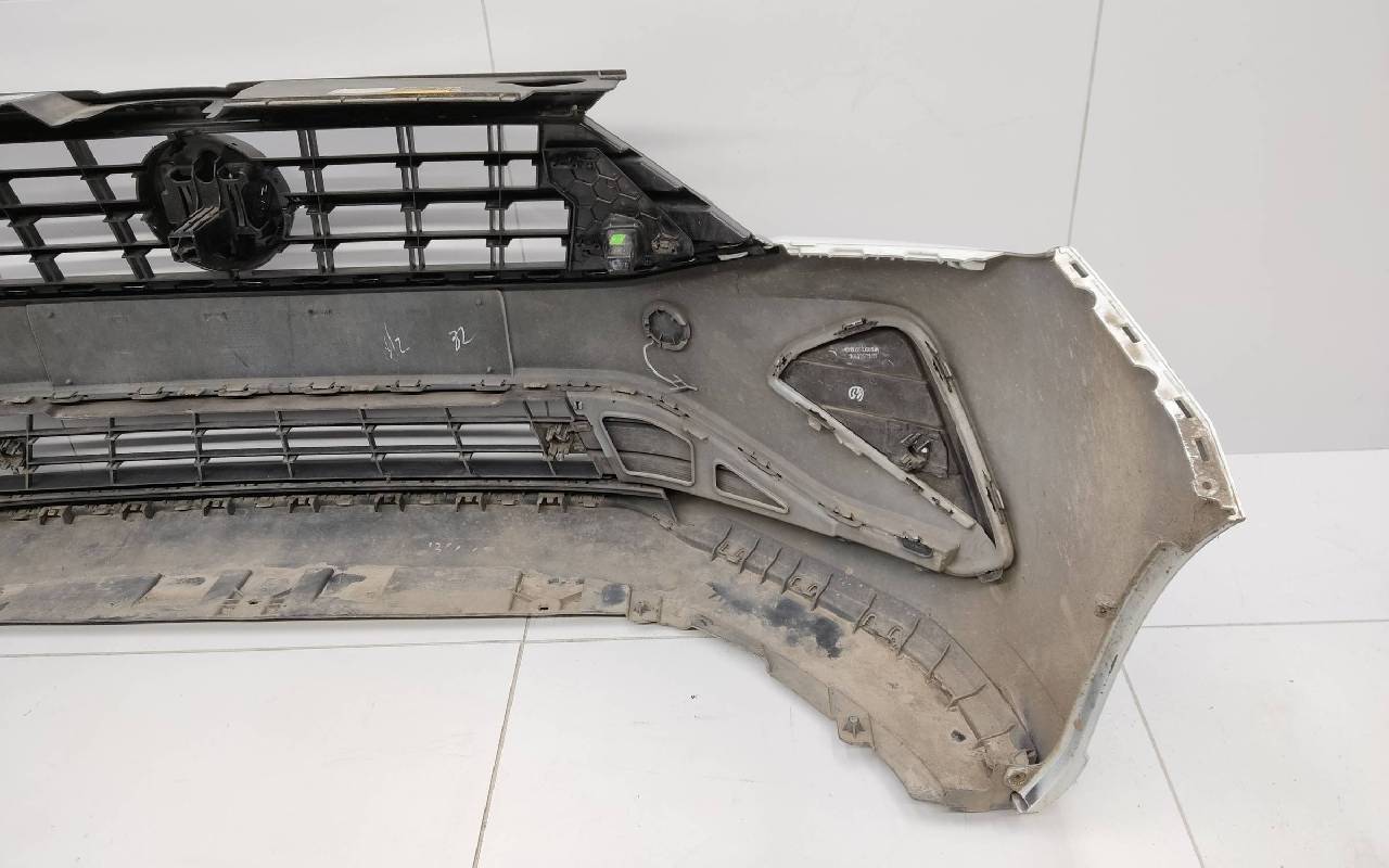 Состояние детали хорошее. Белого цвета в сборе. Небольшая трещина в нижней части бампера, дефект пластика решетки и левой накладки на фото. Лопнул один нижний замок, отсутствует одно крепление на левой накладке. Потребуется незначительный ремонт