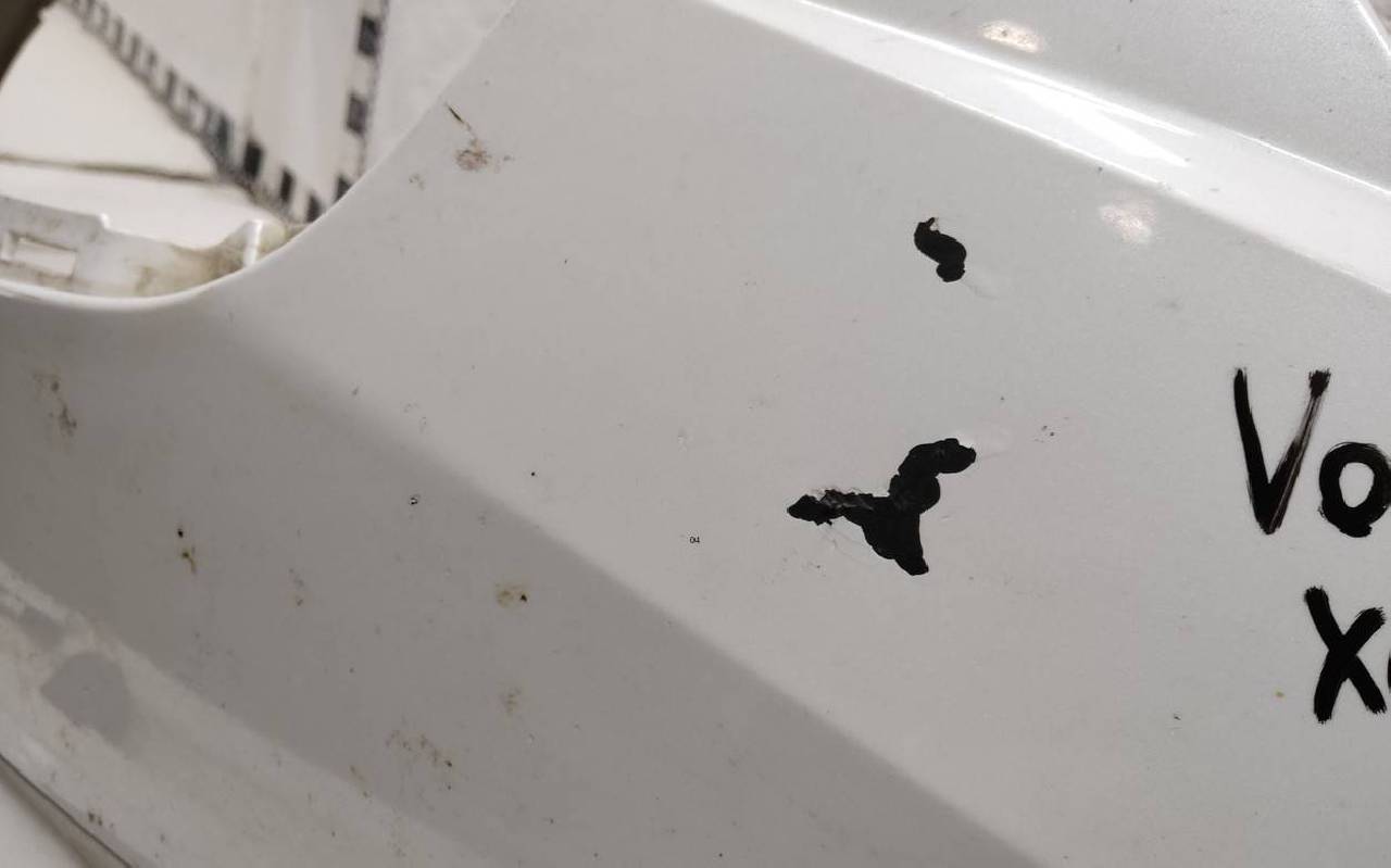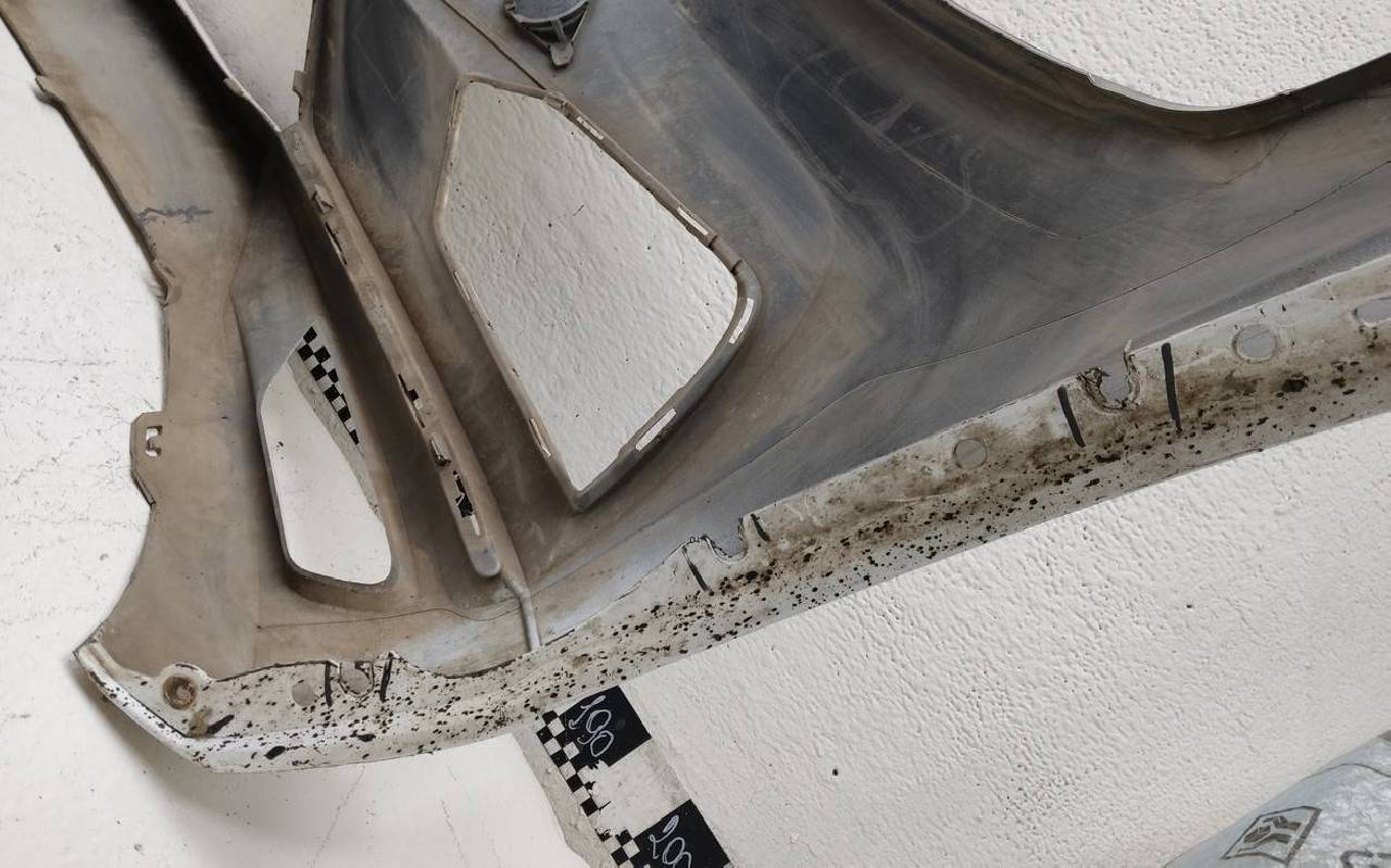 Состояние детали хорошее. Белого цвета, скол ЛКП. Сломано три крепления под правый подкрылок. Потребуется незначительный ремонт